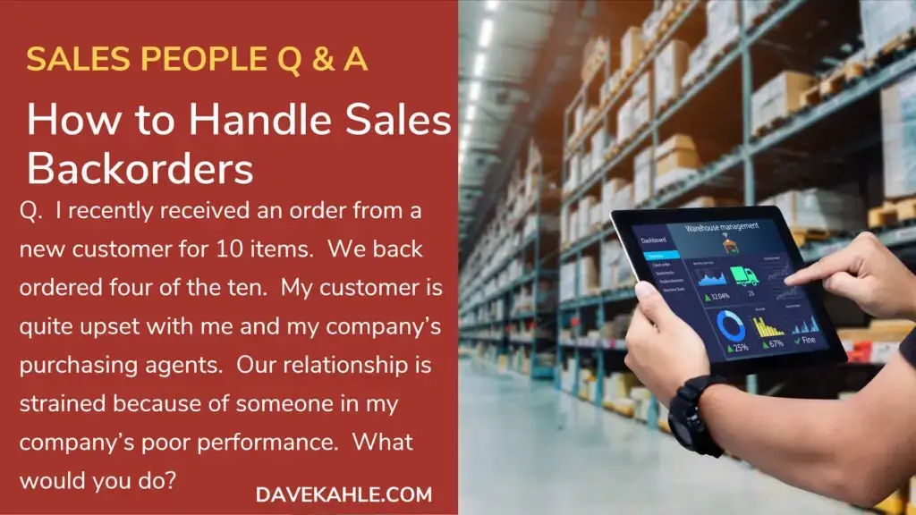 by Dave Kahle Q.  I recently received an order from a new customer for 10 items.  We back ordered four of the ten.  My customer is quite upset with me and my company’s purchasing agents.  Our relationship is strained because...