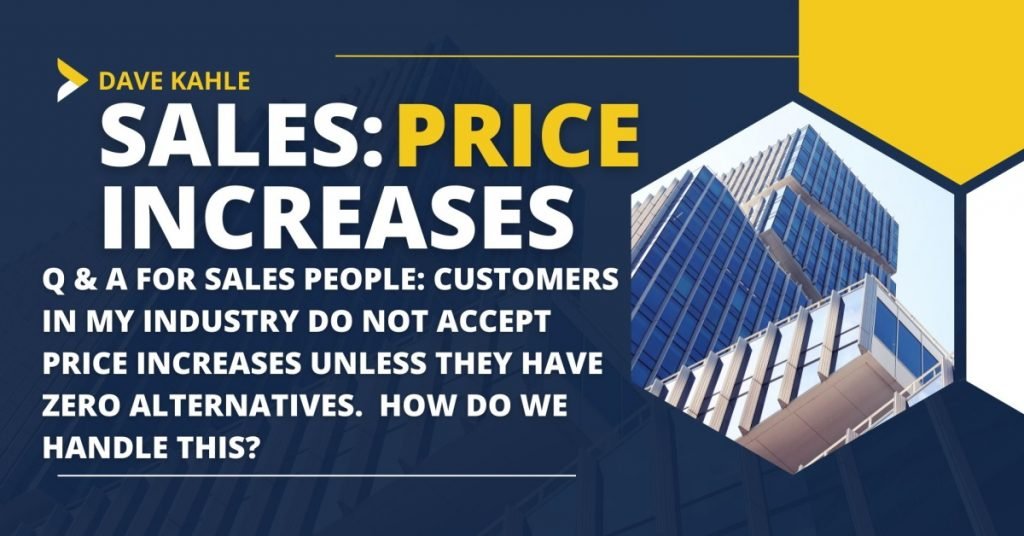 Question: Customers in my industry do not accept price increases unless they have zero alternatives.  How do we handle this? Answer: I’m sure you are not the only person thinking this way, nor is your industry the only one with...